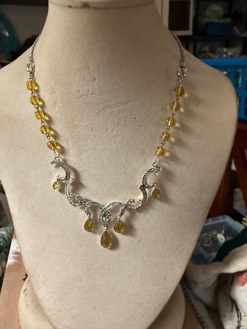 Using vintage ceramic beads, the dangle off an earring and filigree accents from a vintage chain necklace, created a blue, white and gold statement.